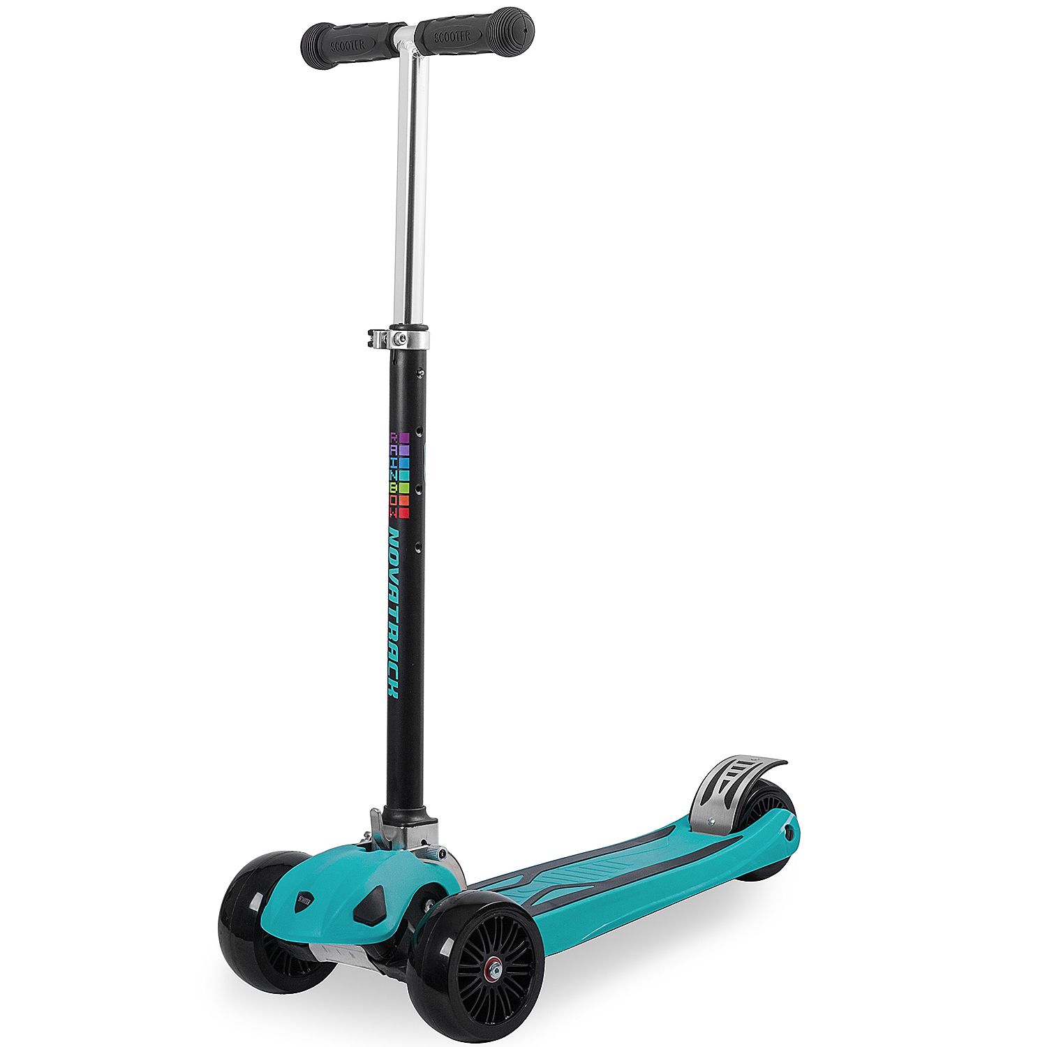 Novatrack RainBow детский трёхколесный самокат-кикборд, предназначенный для детей от 3 лет. Широкие передние колеса делают самокат более устойчивым и проходимым. Имеется регулировка руля по высоте в трёх положениях. Самокат выдерживает до 70 кг.