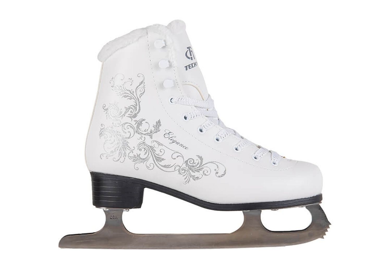 Новая продвинутая модель коньков Elegance от российского бренда Tech Team будет по душе любой девушке. Дизайн коньков с узорами в виде серебра и надписью «Elegance» выделят Вас из большинства! Коньки очень удобно снимать и одевать при наличии одной только шнуровки, вверху установлены специальные крючки. Материал коньков сделан из морозостойкой искусственной кожи. Внутренняя часть состоит из мягкого и теплого меха. Удобный и прочный каблук сделан из полипропилена.