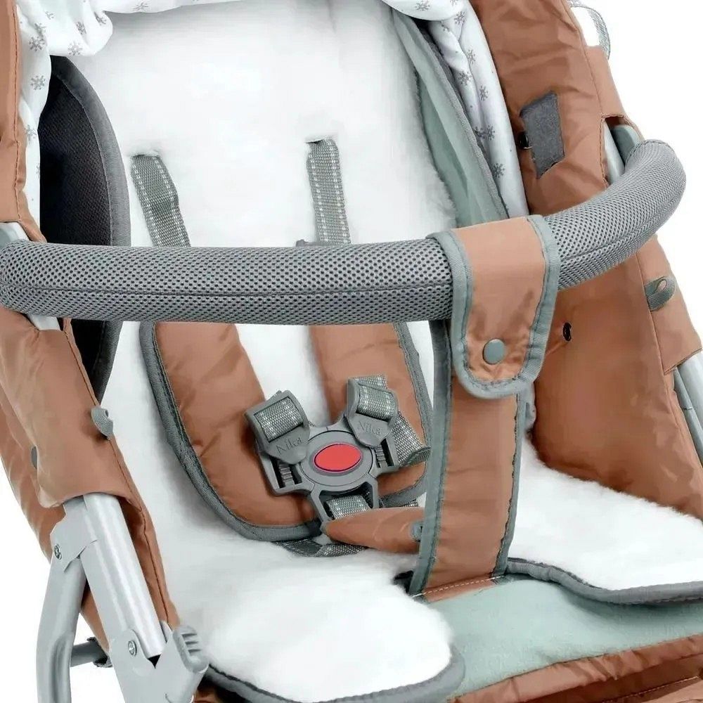 Комплектация включает чехол на ножки, рюкзак для мамы, муфты-варежки, съёмный меховой матрасик и прозрачный тент от ветра и дождя.