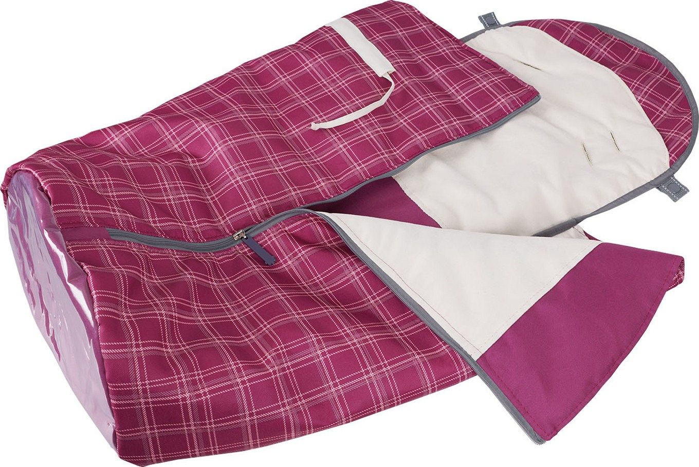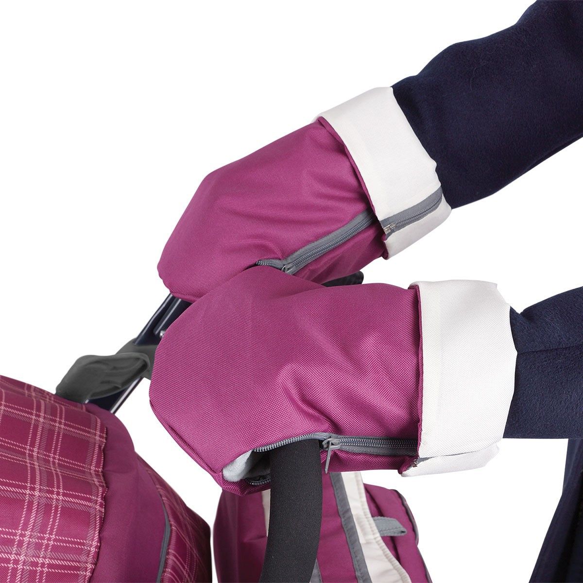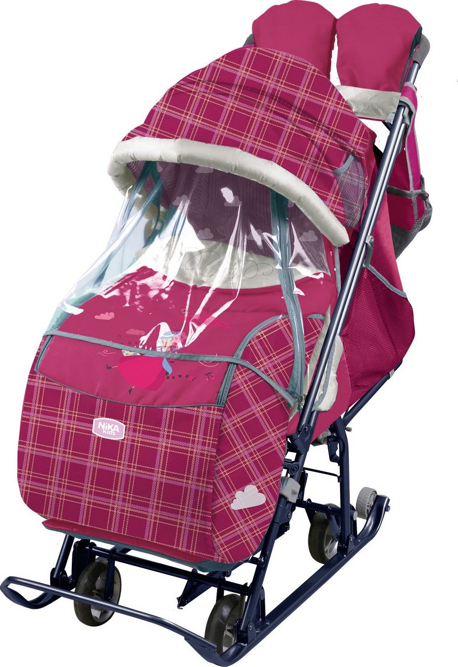 Санки-коляска также оснащена съёмным прозрачным тентом-дождевиком, который защищает от непогоды. В комплект входят набор аксессуаров: удобная сумка для хранения мелочей и тёплые рукавички для родителей. Конверт-вкладыш на молнии обеспечивает дополнительное тепло и комфорт для ребёнка.