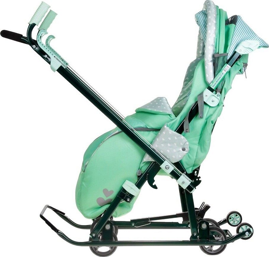 Плоские полозья шириной 40 мм и высокопрочный стальной цветной каркас обеспечивают надёжность и долговечность конструкции. Механизм смены полозьев на колеса (выдвижная колесная база) позволяет легко адаптировать коляску к различным условиям. Высокий складной трёхсекционный козырёк с увеличенной высотой по спинке создаёт комфортные условия для малыша, даже если он в шапке с помпоном.