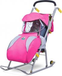 Санки Ника имеют легкую металлическую раму. Кресло санок сделано из специальной ткани, которая хорошо защищает от влаги. Санки оснащены устойчивыми полозьями для скольжения. Вся конструкция санок складывается. Санки-коляска имеет элементы безопасности, чехол для ног и удобные ручки для управления.