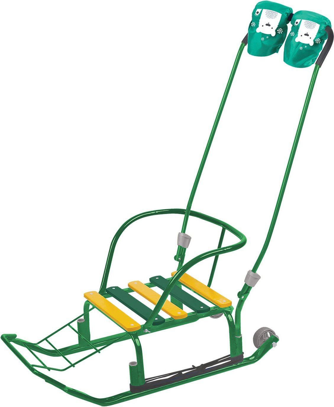 Металлические санки со складной родительской ручкой-толкателем для катания и перевозки детей.