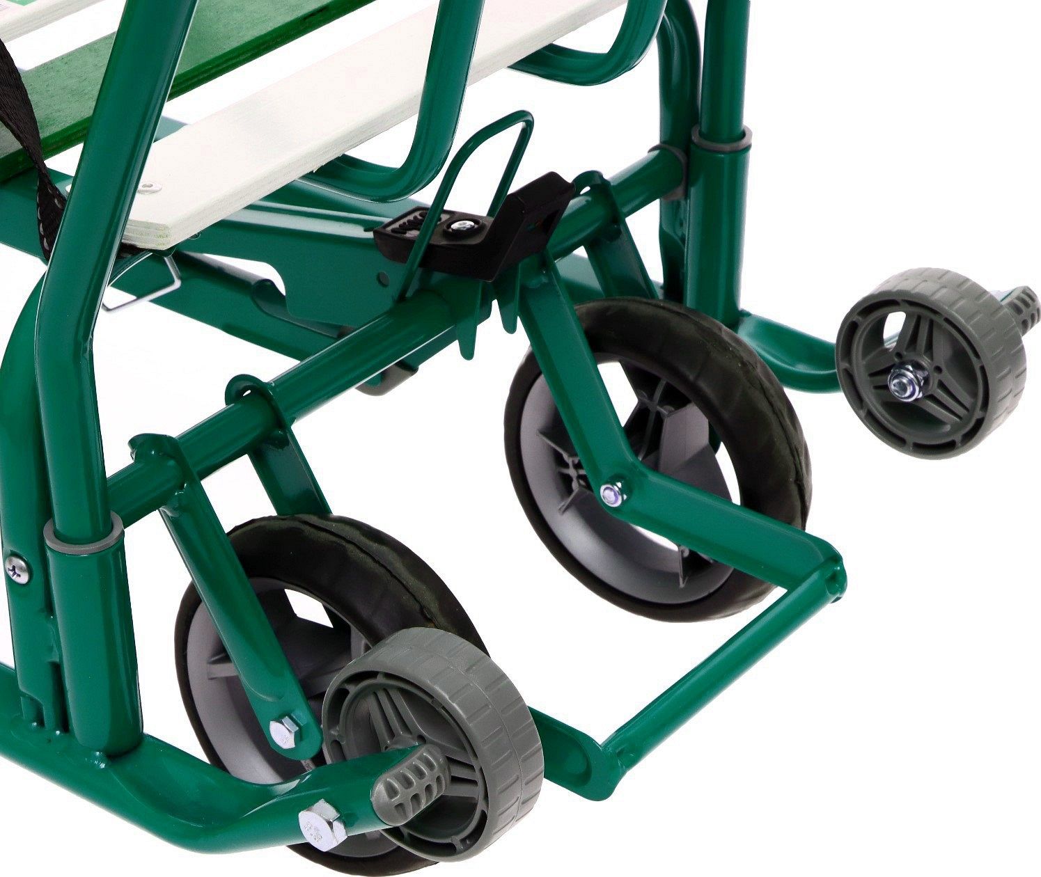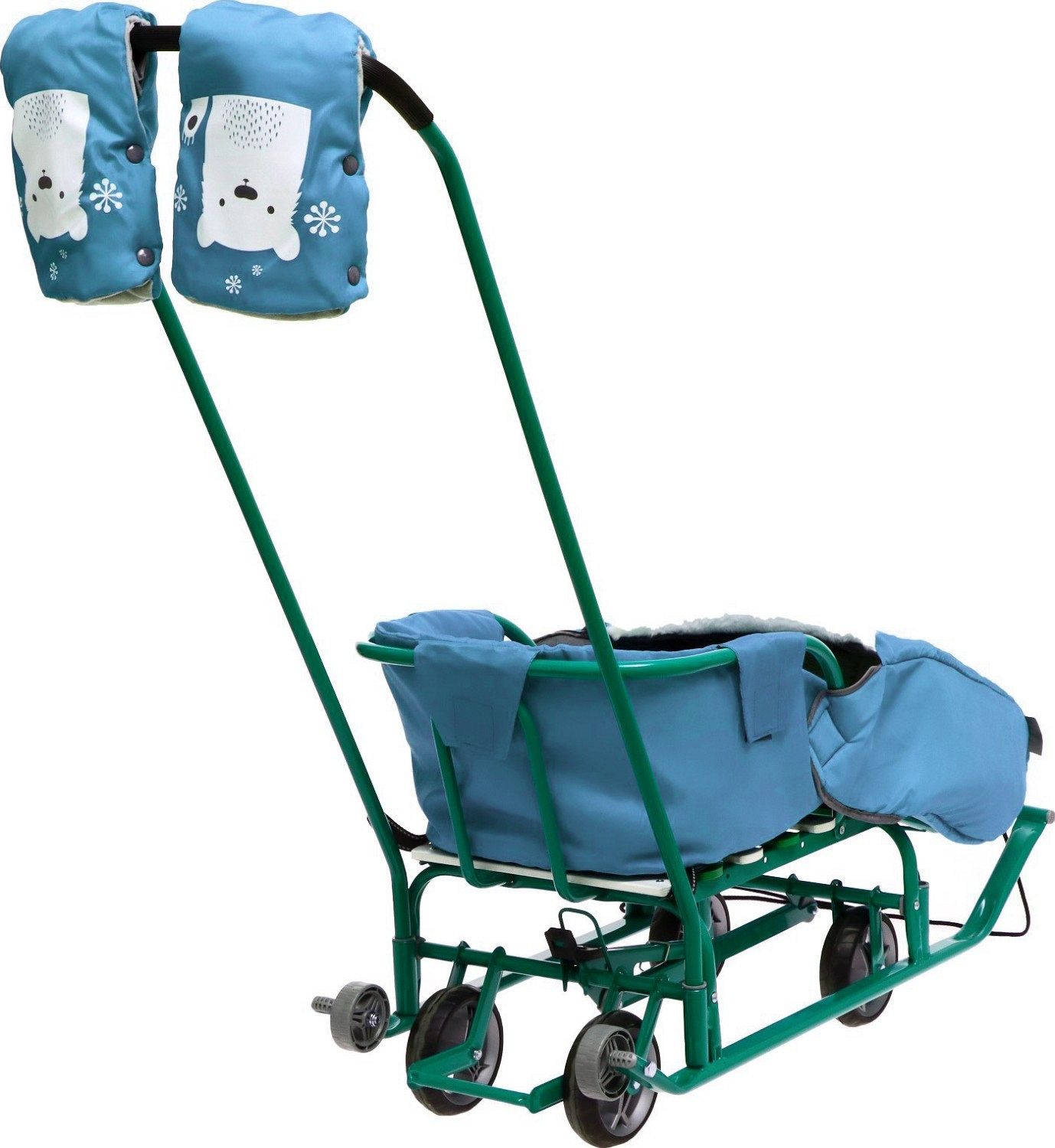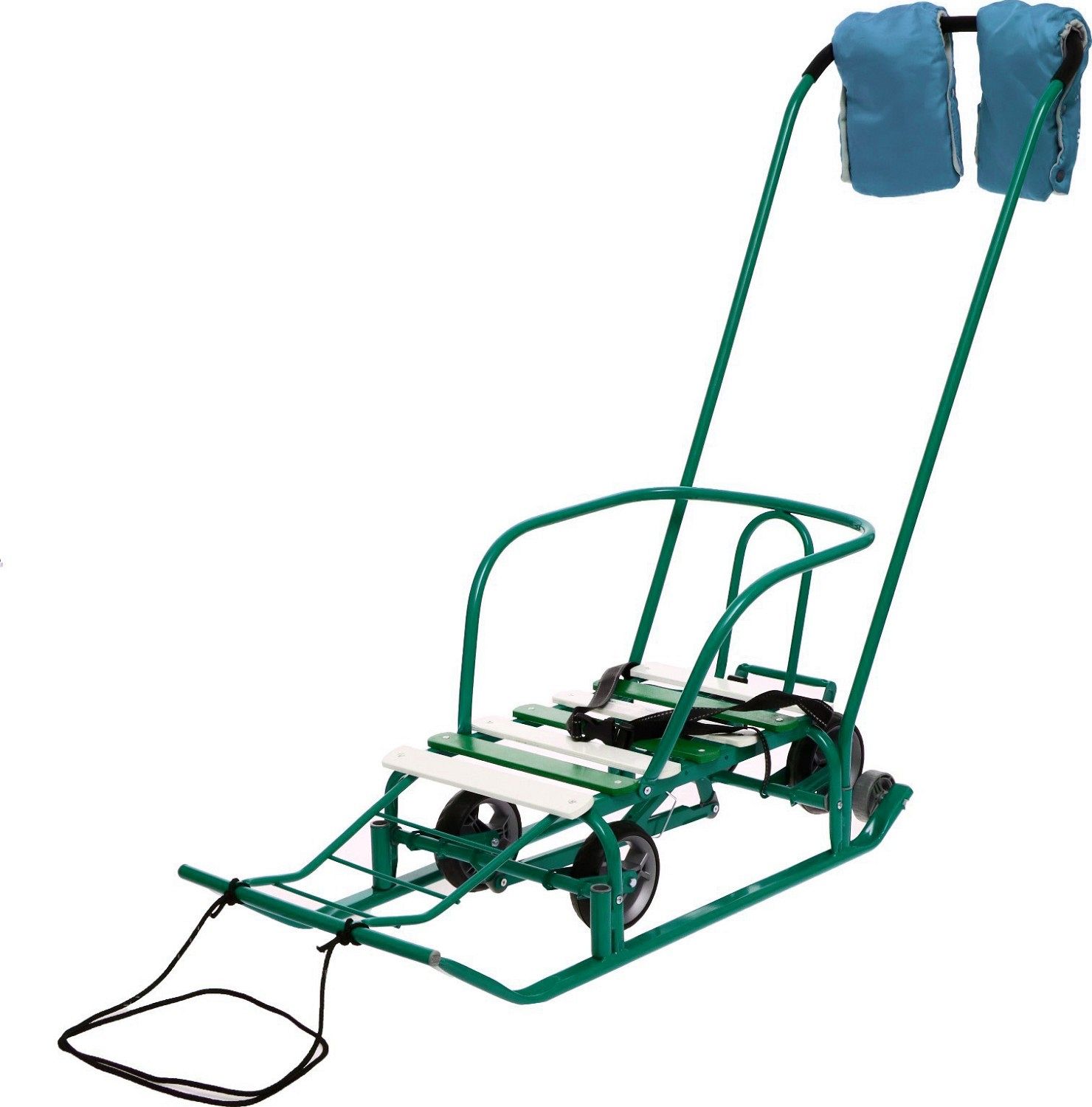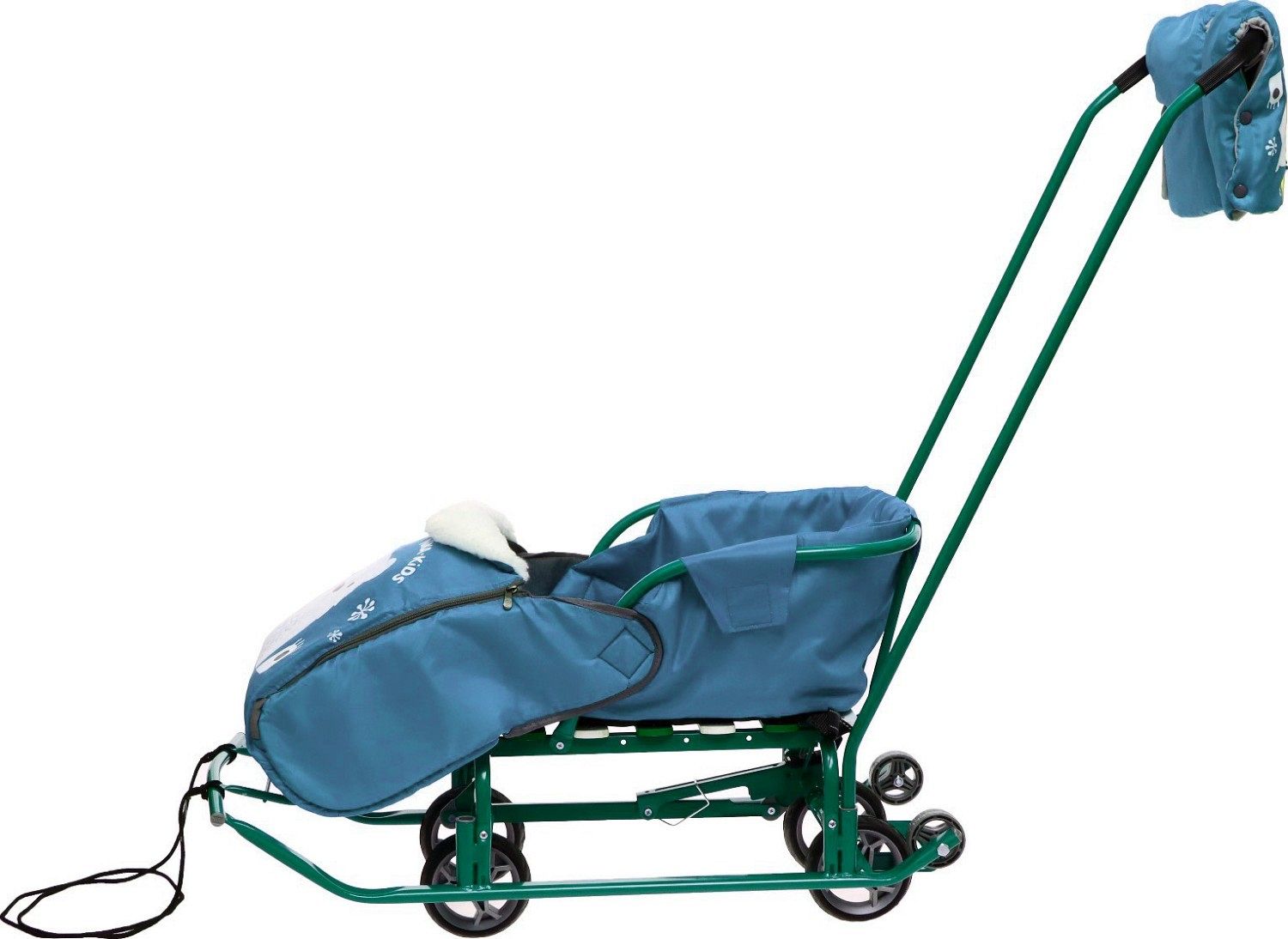 Выдвижная колёсная база с прорезиненными колёсами и двумя колёсами на задней части полозьев позволяет легко переключаться между режимами скольжения и передвижения по твёрдым поверхностям. Грузоподъёмность санок составляет 25 кг, что позволяет использовать их для детей разного возраста.