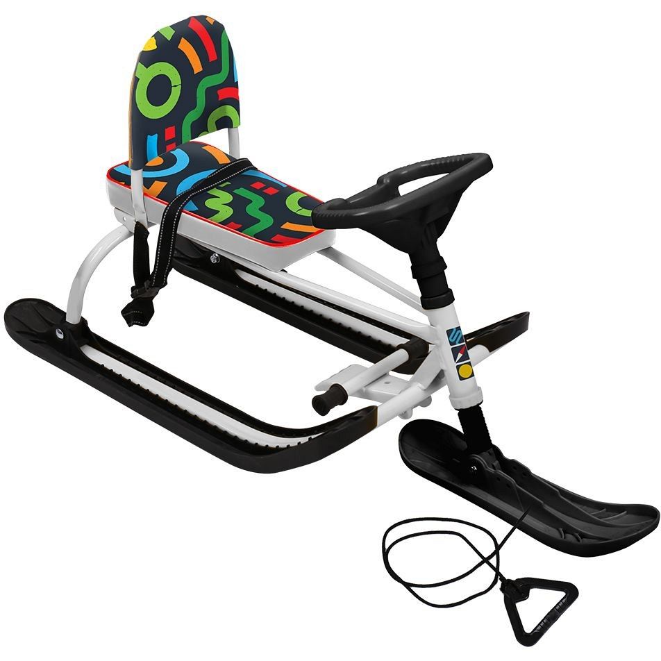 Снегокат оснащён множеством продуманных функций, которые делают его использование простым и удобным. Мягкое сиденье с двумя положениями позволяет регулировать расстояние от руля, что обеспечивает максимальный комфорт для растущих детей. Спортивный руль и складная спинка добавляют элемент динамики и удобства, а ремень безопасности гарантирует надежную фиксацию во время катания. Буксировочный трос с автоматической намоткой и усиленный тормоз делают управление снегокатом легким и безопасным.