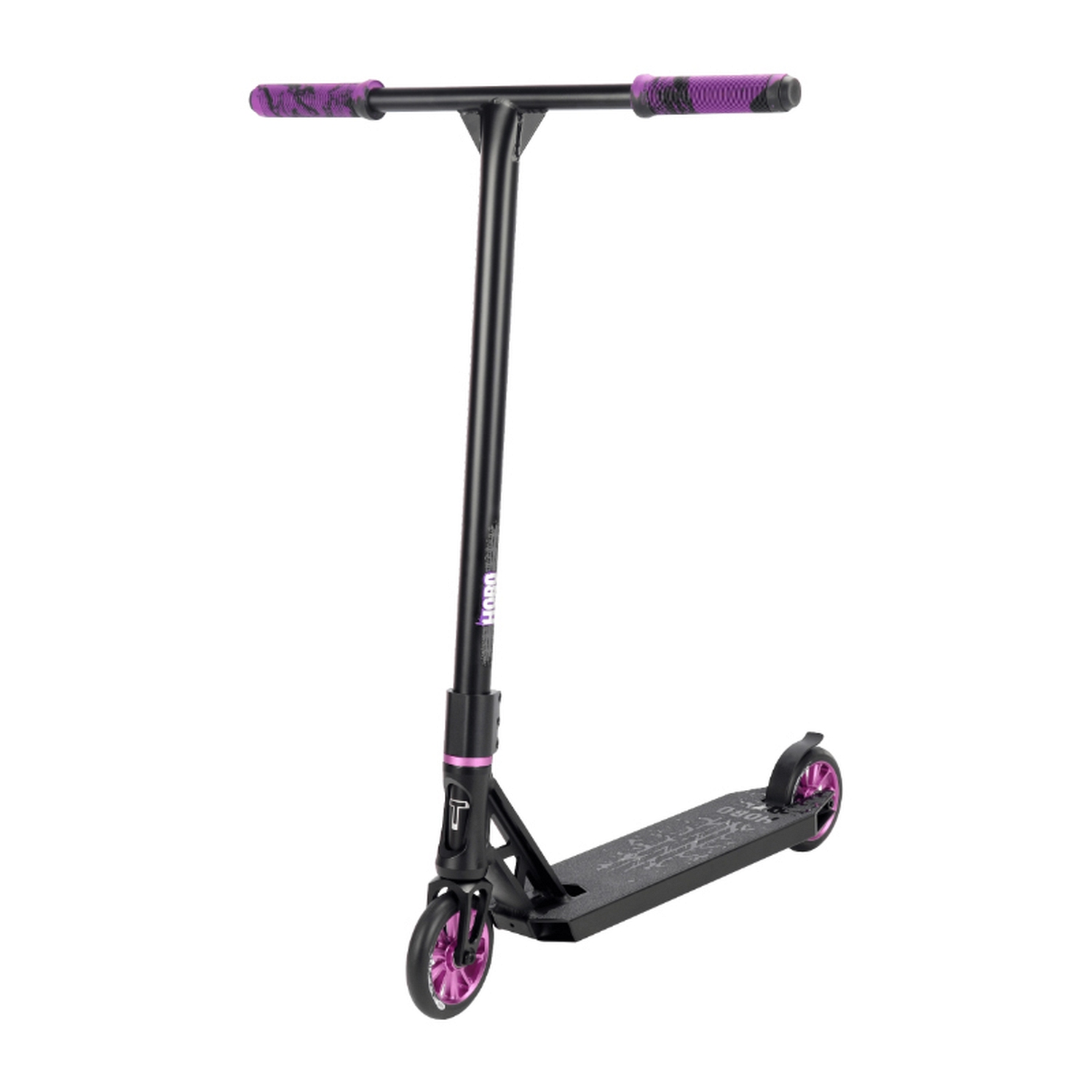 Hobo - универсальная модель подходящая для катания как в парке, так и на улице. T-образный руль черного матового цвета с мягкими резиновыми грипсами и пластиковыми барендами, выполнен из хромолевой стали CrMo. Высота руля от зажима до ручек 610 мм, ширина - 580 мм, диаметр - 34,9 мм. IHC зажим на трех шестых болтах и вилка самоката изготовлены из алюминия, интегрированная рулевая на промышленных подшипниках. Колеса 120x24 мм c SHR Super High Rebound - сверхвысокий отскок - полиуретаном, жесткостью 88A. Подшипники Abec 9. Дека выполнена из сплава AL 6061, длина деки 500 мм, ширина - 120 мм, footspace - 360 мм. Модель выпускается в черно-фиолетовой и черно-зеленой цветовых комбинациях. Рисунок на шкурке выполнен методом трафаретного напыления.