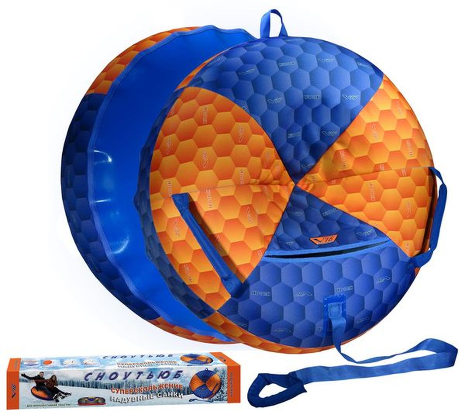 Сноутьюб имеет усиленные, объемные, мягкие ручки и буксировочный фал по технологии SUPER GRIP, крепление днища двойным швом и протестирован в прокатных центрах. Морозостойкость до -30 градусов по Цельсию. Благодаря малому размеру и весу изделие прекрасно годится для использования детьми.