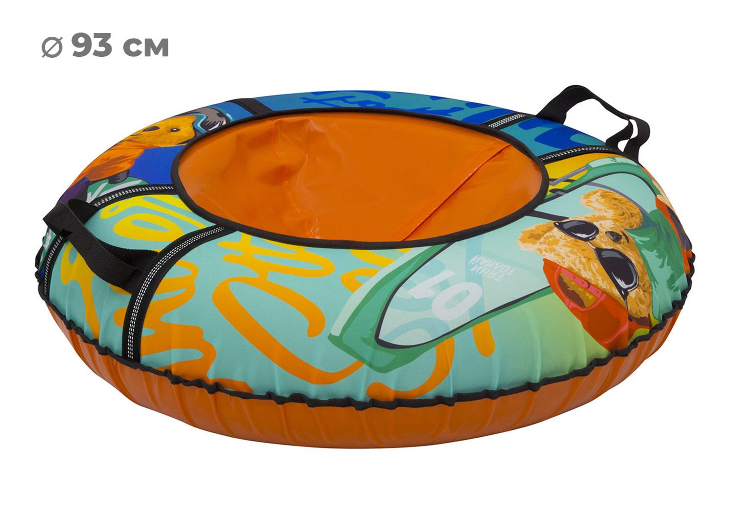 Размер тюбинга составляет 93 см, этот размер позволяет кататься на нём детям ростом до 140 см. Данный тюбинг выдерживает вес до 80 кг