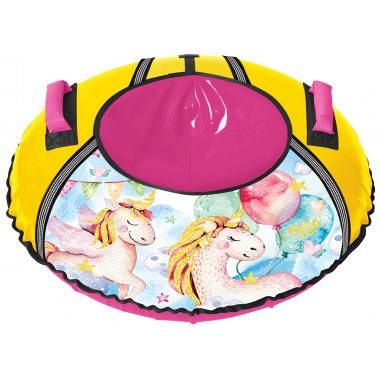 Тюбинг с мерцающими блестками и с рисунком единорога изготовлен из прочного тента, который устойчив к морозам до 28 градусов, все швы усилены капроновой лентой.